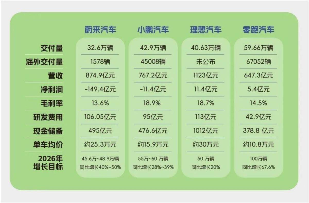 2025年第四季度,蔚来交出了2.83亿元的净利润,这是蔚来成立11年来的第一次。同一个季度,小鹏汽车也实现盈利,赚了3.8亿元。零跑全年净赚5.4亿元,是继理想之后第二家全年盈利的新势力。